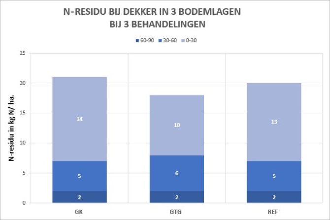 Het N-mineraal in de onderste bodemlaag (60-90 cm) is op alle percelen gelijk en laag (2kg N/ ha). De verschillen in de middelste bodemlaag waren klein. In de bovenste bodemlaag (0-30 cm) was N-residu in het de GTG-behandeling iets lager van in REF, en het verschil tussen GK en REF bedroeg slechts 1 kg N/ ha.