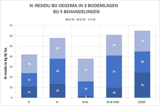 Bij Oegema wordt de indicatieve grenswaarde van 46 kg N/ ha niet overschreden bij de ‘0’ en de ‘N+K’ behandelingen. Mogelijke verklaringen hiervoor zijn dat bij de ’0’ behandeling alle beschikbare stikstof volledig is benut, en dat de kali bemesting in de ‘N+K’ behandeling leidt tot een goede benutting van de bemeste kunstmest-N.