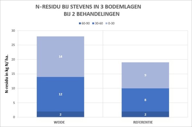 De analyse laat zien dat het N-residu in de onderste bodemlaag (60-90 cm) in beide percelen laag is (2 kg N/ ha) en geen verschil toont. Het N-residu in de twee bovenste bodemlagen is lager op het referentie perceel dan op het perceel met najaarsbeweiding.