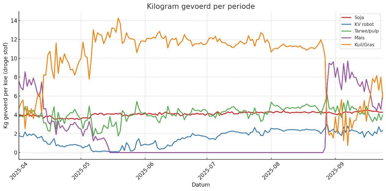 In april en mei werd gemiddeld 15 kg krachtvoer per 100 kg melk verstrekt. In juni en juli steeg dit naar 20 kg en in augustus naar 22 kg. De melkproductie bleef daarbij stabiel op 33 liter per koe, met een lichte stijging ten opzichte van voorgaande jaren.