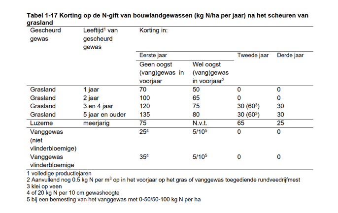 Na het scheuren van grasland komt veel N vrij en kan er fors worden bespaard op de N-bemesting (zie tabel 1-17). Het is van belang hier goed rekening mee te houden om onnodige N-verliezen te voorkomen. De bespaarde N kan dan worden gebruikt voor het nieuw ingezaaide gras dat een hogere N-behoefte heeft dan ouder grasland. Om risico’s van stikstofuitspoeling zo veel mogelijk te beperken, is verder het advies om in wisselbouwsystemen het grasland niet ouder te laten worden dan 3-4 jaar. Bij ouder grasland is de verwachte mineralisatie dermate hoog dat deze niet meer door het volggewas kan worden opgenomen. Het is verder aan te bevelen om, als dat mogelijk is, een vanggewas te zaaien na het bouwlandgewas, dat wordt geteeld na het scheuren van het gras.