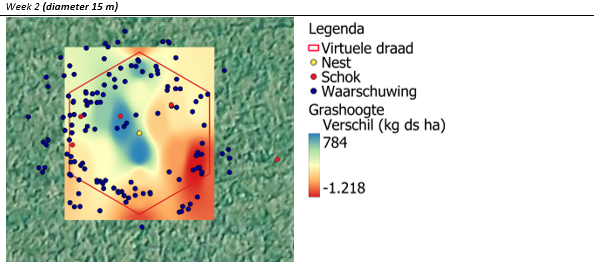 Week 2 (links). Eén nest draadloos uitgerasterd. Alleen westkant draadloze afrastering