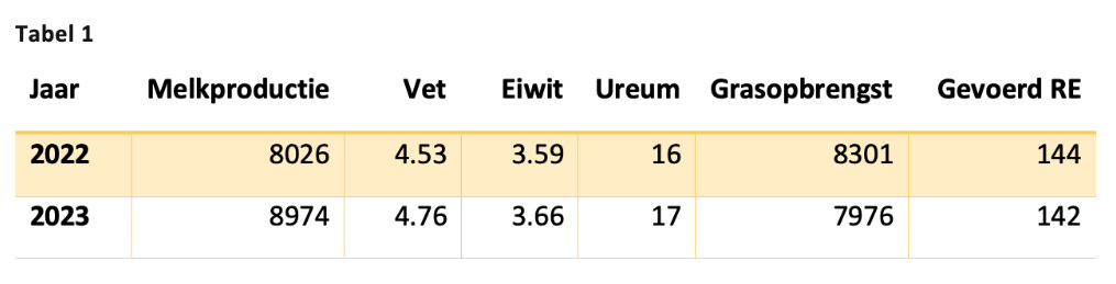 In tabel 1 wordt een overzicht gegeven van de melkproductie en het RE-gehalte.