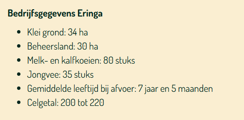 Pier Eringa beheert samen met zijn gezin 34 hectare grasland, waarvan 20 hectare huiskavel. In het voorjaar wordt de helft van de huiskavel gebruikt voor beweiding. “De koeien worden ongeveer 200 dagen per jaar geweid, afhankelijk van de weersomstandigheden. Overdag grazen de koeien buiten, terwijl ze ’s avonds worden bijgevoerd met graskuil.”