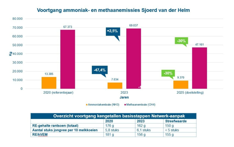 Het afgelopen jaar hebben we scherp gestuurd op het verlagen van het ruw eiwit in het rantsoen, terwijl we veel kVEM hebben gevoerd om de productie op peil te houden. Daarnaast hebben we het RE-gehalte in de brokken inzichtelijker gemaakt. Dit hielp ons niet alleen om beter te sturen en kosten te reduceren, maar ook om emissies te verlagen.