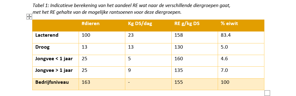 NB: Vaak zullen meerdere krachtvoeders gevoerd worden, het indicatieve RE gehalte kan dan als richtlijn dienen om te zien of een bepaald krachtvoer bijdraagt aan 155 RE op rantsoenniveau, of juist niet. Dit is een heel ruwe richtlijn. Er zijn vele factoren die dit gehalte kunnen beïnvloeden. Zo zal bijvoorbeeld de opname anders zijn bij een andere verhouding gras- en maissilage.