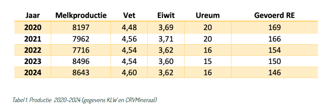 In tabel 1 zijn de bedrijfsgegevens van 2020 tot en met 2024 weergegeven. Hierin is te zien dat de grammen RE per kg DS al jaren achtereen dalen. Maar ook de melkproductie is gedaald, al is die de laatste jaren wel weer gestegen.