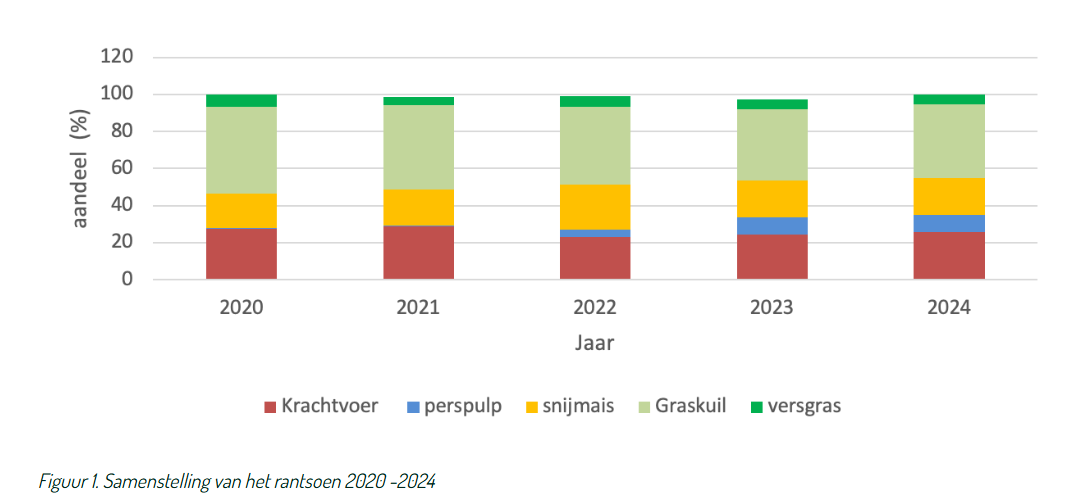 Uit figuur 1 blijkt dat er door de jaren heen meer perspulp wordt gevoerd en iets minder krachtvoer.